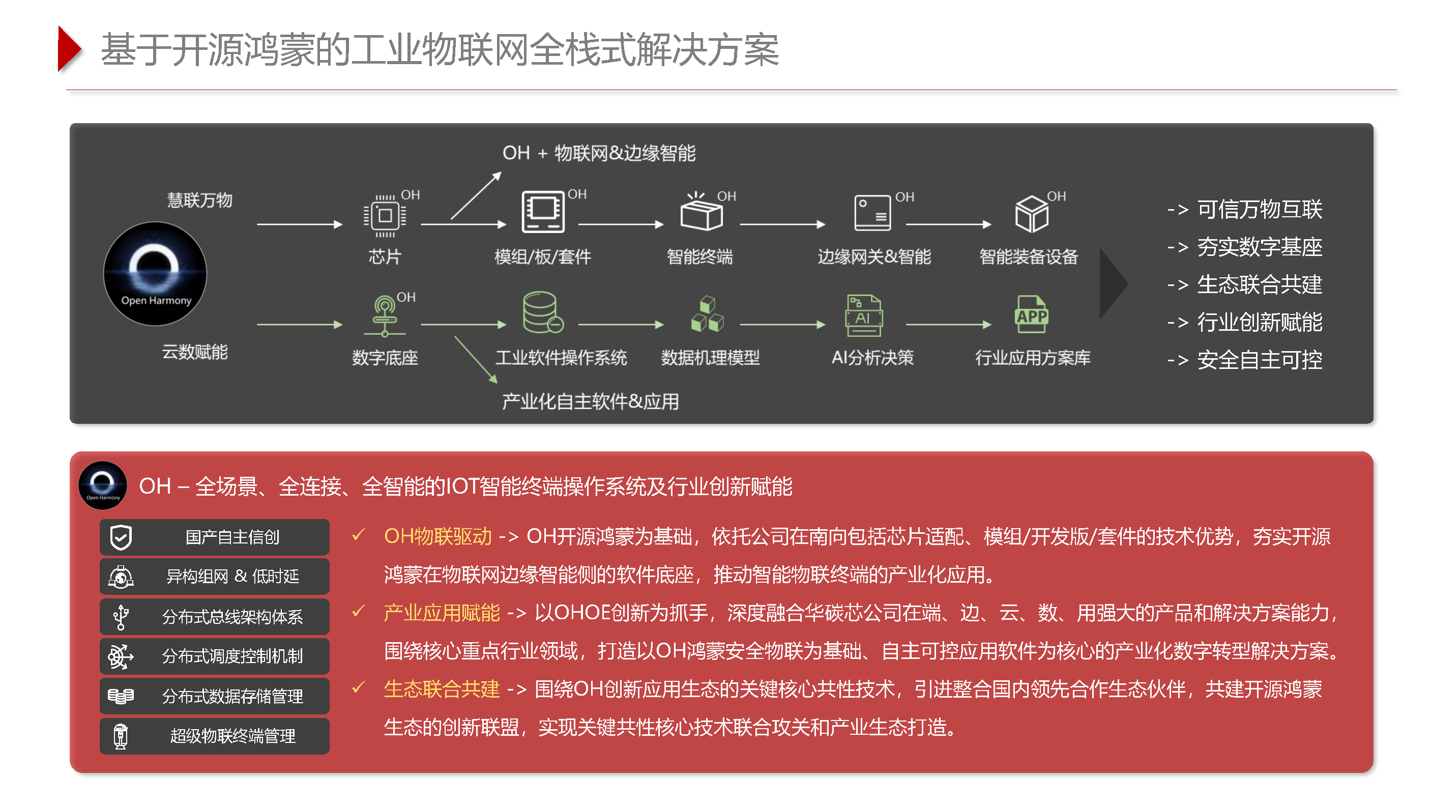 公司以发展数字经济助力数字经济的产业落地融合为己任 重点布局 AI 芯片适配与应用使能 、 底层技术创新 、 开发平台订制 、 大数据智能分析等业务领域 。 以当前主流的 OS 技术底座为基础 紧跟开源生态产业趋势 聚焦行业国产化改造 面向万千客户提供一站式的企业数智化转型升级解决方案 技术赋能企业数字化升级 。
